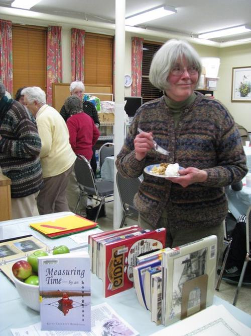 Library patron Gwendolyn Kelton, enjoying refreshments at the book discussion of "The Orchard".
