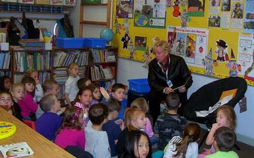 Denise Andrews reading to the kids in Janet Richardson’s class at Pleasant Street school, for Community Reading Day.