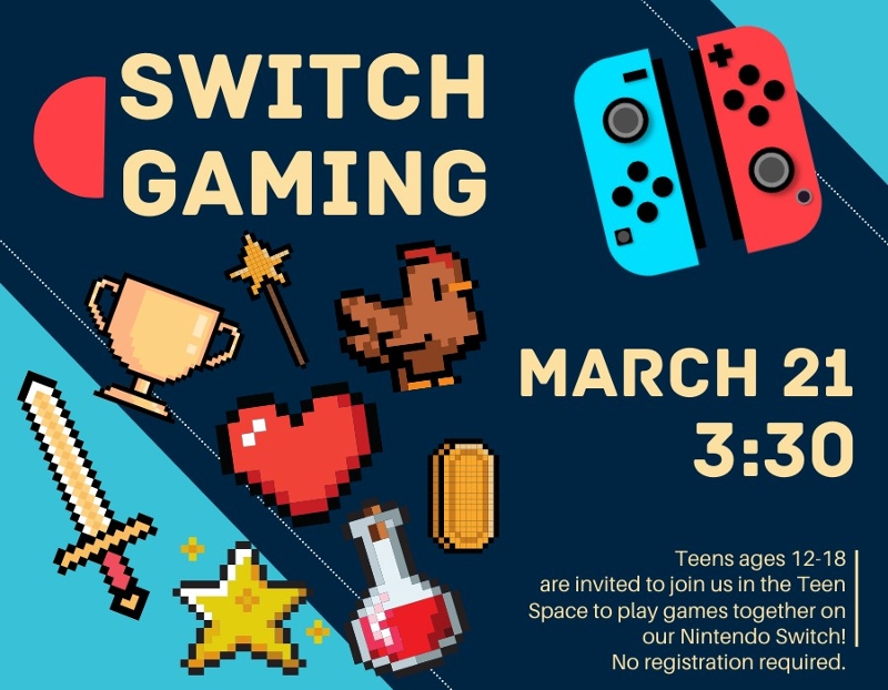 Teens ages 12-18 are invited to drop by for some casual gaming on the library's Nintendo Switch. Enjoy Super Smash Bros, Minecraft Dungeons and more!