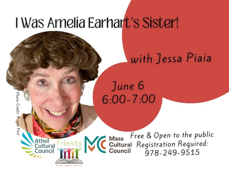 Free & Open to the Public! Registration required. You can register online with our library calendar: https://athol.librarycalendar.com/event/i-was-amelia-earharts-sister-meet-muriel-morrissey-2546 or by calling 978-249-9515. You will receive an email confirmation, and an email reminder of the event 24 hours before the program. Questions? Please call the library at 978-249-9515.