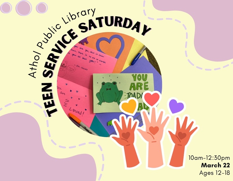 On Saturday, Marc 22, join us at the Athol Public Library's Teen Space for Service Saturday. We'll be joining forces to create Cards for Hospitalized Kids. All teens, ages 12 -18, are invited to drop by between 10am and 12:30 to join us. No registration is required to attend, but we ask that you sign in when you arrive if you are hoping to have volunteer hours verified.