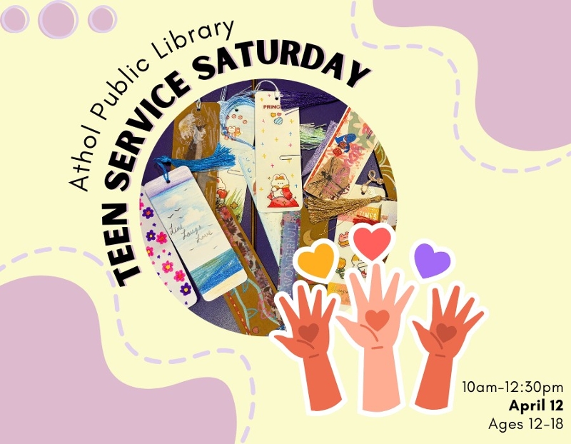 On Saturday, April 12, join us at the Athol Public Library's Teen Space for Service Saturday. We'll be joining forces to decorate bookmarks to share with our community. All teens, ages 12 -18, are invited to drop by for as long as you can between 10:00am and 12:30 to join us. No registration is required to attend, but we ask that you sign in when you arrive if you are hoping to have volunteer hours verified.