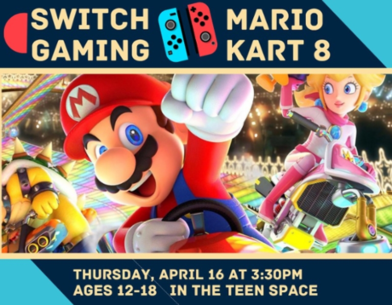 Teens, ages 12-18, are invited to drop by the Teen Space for some casual gaming on the library's Nintendo Switch. Race each other as your favorite characters in the zany maps of Mario Kart 8.
