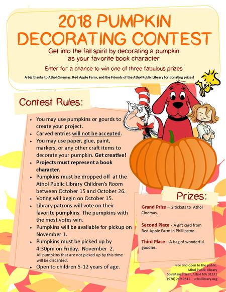Decorate a pumpkin as your favorite book character! Voting begins on October 15th.